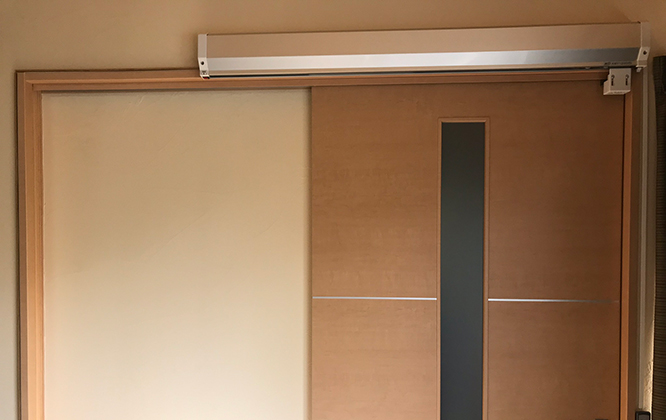 引戸の鴨居上部に簡単に設置ができるので、上吊引戸をそのまま自動引戸化。自動閉鎖で閉め忘れがなく、室内が丸見えになりません。静かに開閉し、お子様から高齢者まで簡単に出入りできるようになります。